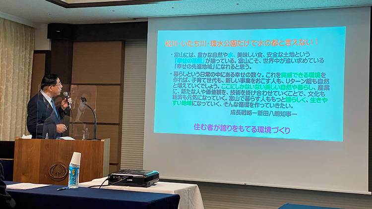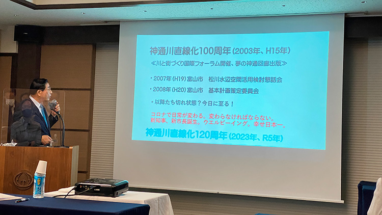 そして、今、考えてみるとですね、2003年には神通川の馳越ということで、直線化100周年ということで平成15年、「川と街づくり国際フォーラム」が開催されたり、「夢の神通回廊」が出版されたなどですね、大変盛り上がった年だったなということを振り返ります。その後、富山市ではですね、2007年にはですね、松川水辺空間活用検討懇話会とか、その翌年には基本計画策定委員会などが作られたんですが、その後、ずいぶんなんか、尻切れトンボになってしまって現在あるんじゃないかと思います。そういうことで、来年はですね、下にも書いてありますように、120周年を迎える年というのが事実でございますので、何かきっかけを作っていかなければならない年ではないのかなというふうに思います。そういうことで、中村社長もなんかないのかなということで、私に声をかけて頂いたのではないかなというふうに理解しているわけであります。そういうことで、今、皆さんもご存知の通り、コロナで大変なことになっていて、私たちの日常が変わってくんだろうと、生活スタイルも変わってくるんだろうと思います。というよりも、変わらなければならない、そういう時代にきてるんだろうと思います。そして、知事も市長もお変わりになってですね、その連携だとかいろんなことがこれからも期待できるわけでありますし、何よりもこの2人がですね、共通なのは、「幸せ」という言葉なので、「ウェルビーイング」というのは「真の幸せ」ということで、身体的にも、精神的にも、幸せになりたいと。今までの経済のデータだけで豊かさを感じるんじゃなくて、人間としてそういう幸せを求めていかなければいけない、そういう時代だと、いうふうに、知事も言っておられます。そして、藤井市長は、「幸せ日本一」な市を目指そう、ということで、共通しているのが、「幸せ」なんだなと。そういうことを考えた時に、私たちのライフスタイルを変えながら考えながら、どういうまちづくりがいいのかということを考えるいい年ではないのかなということを思ってます。そして、今日は、私は土地改良区もやってますので、今日の話は、松川への水はどこからこうきてるんだろうか、という話と、それから、真の「水の都とやま」に向けてですね、どうしたらいいんだろうかな、と。そこらへん、街の中に水を流したらどうか、と、いう話。それから、松川を活かすには、馳越の歴史は充分ご存知なんだと思いますけども、やはり、立山から流れ出る水の源流を辿ってですね、ここまで水がきてるんだということをですね、やはり、語れること、語ることがやっぱり大事じゃないのかなというふうに思います。そしてまた、まちづくりという点については、これまで、街の中に公園を作る、という発想なんですが、そうではなくて、公園の中に私達の街があるんだ、という発想を転換をしてですね、まちづくりをすることにしなければいけないんじゃないかと。その上で、松川周辺の整備はどういうふうにあればいいのかなということを、一つ二つ、しゃべってみて、そしてまた、それらを実現させるにはどうしたらいいのかなということを皆さんで考えるきっかけを何かしゃべってみたいなというふうに思ってます。