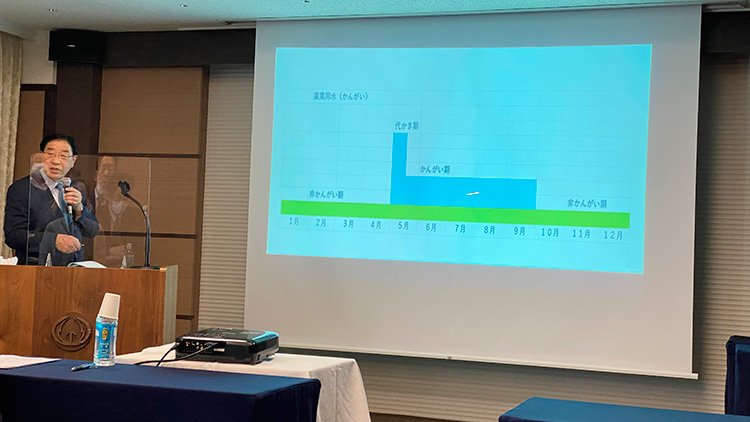 それで、松川に流れている水を整理しますと、要するに農業用水が、頭から入ってきてですね、この地域を流していると。そして、先ほど言いました太田用水路ですね、それが太田川になって、松川に入っていたち川に入って神通川に入っていくと。そして、清水又用水というのは、これはいたち川のさっき言った、西番のセレモニーのあそこから取っている水路でありまして、それが松川に行って、いたち川に行って、神通川に行っている。こういう水がですね、松川に注ぎ込んでいるんだ、ということをですね、ご理解して頂きたいと思います。ところで、農業用水というのはどういう水かと言いますと、1月から12月、こう見てみますと、農業用水というのは、灌漑のため、要するに稲を作るために、作物を作るための水だということに定義されているんです。それで、水田の場合は、ほとんど、5月にですね、代(しろ)かきということで、その時に一番ピークの水が必要なんです。それから9月の末まで、稲を作る時に水が要るということで、こういう水の使い方をしているのが農業用水なんです。ところが、このまっすぐ、非灌漑期、要するに、田んぼは、耕作してない時に使う水というのは、水路はですね、水を止めてしまうと涸れてしまうので、やはり、維持管理上ですね、常にある程度、一定の量を流さなければならないということで、一定量だけ認めてもらって、流してるっていうのが維持管理用水ということなんですね。ですから、農業用水といえど、水のある時とない時が変化してるもんだということを覚えておいてもらえばいいと思います。それで、私はですね、真の「水の都とやま」にするには、とにかく、農業用水が、神通川に向かってきてるんだということ。そして、網の目のようにして流れているということ。そして、その水はですね、常願寺から横江の頭首工、あるいは、有峰やいろんなところで発電をしながら、横江頭首工と発電の水を経てですね、常西合口用水路が全部受けて、平野部へ流されている、と。そして、水田のあるところまで用水が供給されてきていると。こういうものがひっくるまって、農村を経て、町の中にも水が流れていたので、そういうところに潤いがあったと。身体で言えばいつもそうやって流れていれば健康な、健全な県土である、と。しかし、水が流れない地域が出てきていることは、大変不健康で不健全な県土だと。これをなんとか改善していかなければいけない。つまり、血液を、水を流すことが極めて大事じゃないかなというふうに思ってます。そこで、今現在、農業用水が流れていない地域はどこだろうか、ということを、是非、皆さんに考えてもらいたいんです。さっき言いました、常西用水の上滝、太いのは、常西幹線用水。これが、いたち川。松川は、ブルーのここが松川です。そして、土川というのはこうなってる。みなさん、こうやって見てわかると思いますが、昔はさっき言いました、このあたりまでが本当の市街地といいましょうか、城を中心にした町があったところなんですが、西中野から上流は全部、田んぼで、農村地域だったんです。ということは、全部ここに田んぼがあったんです、田んぼが。ところが、ご存知の通り、田んぼが全部なくなってしまって、住宅や商業地ということで、ほとんど埋め尽くされてしまってるわけであります。ということは、田んぼのないところには、農業用水が流れ込まないということになるわけです。ですから、これが、高速道路ですけども、高速道路から、北側というのは、かなり宅地化されていて、この地域が潤いがなくなってきているんじゃないかと。特に、今はですね、これは四ツ谷川とか、冷川とか、これ佐野川なんです。先程、話があったんじゃないかと思いますが、この松川に流れ込む水が、さっき言ったように、農業用水がなくなってしまうので、ほとんど汚くなってしまってですね、雨水しか受け取れない、そういう松川になってしまったんです。それでなんとかしなければいけない、ということで、土川からの水を、佐野川に入れようということで、2トンぐらいの水を入れてされていると。ですけど、果たしてそれだけでいいんだろうか、と。やっぱり、この街の中に、水をですね、流すことがですね、富山が本当に住む人にとっても、水の潤いながら住める環境の水の都の街になるんじゃないかと思うわけであります。