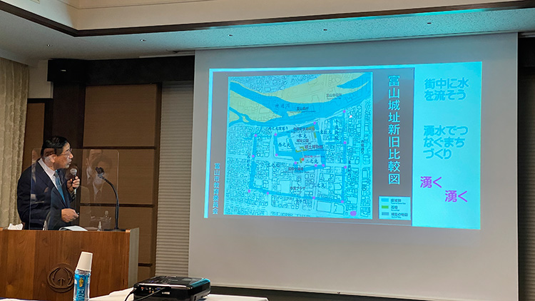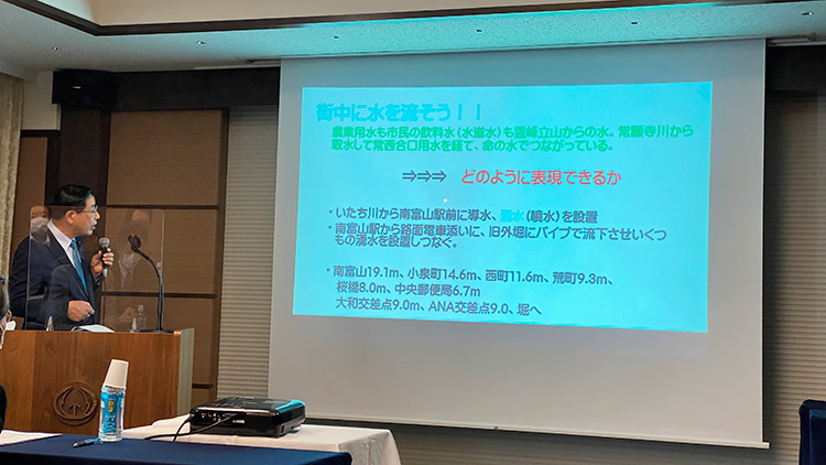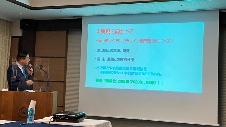 そんなことで、じゃあこういったようなことをどうやって実現していけばいいかということなんですが、最後に。やはり、何と言ってもこれは、富山市さんが、街のグランドデザインをですね作る、ということが、まず、一番大事なわけです。そういう中で、県との協議だとか、あるいは、民間との役割分担しながらですね、進めていくということだと思います。そして、一番大事なのは、要するに、市民が誇りを持って水を語れる街にするためにはですね、今までも皆さん方のこの協議会がいろんなところで取り組んでいるわけでありますが、まさしくそういう民間組織として、そういう皆さん方に声をかけて、どうやったらいいかということを啓蒙していくという作業が大事じゃないのかなと思います。特に、歴史性とか、あるいは、自分達が住んでいる街が自慢できるものにするためにはですね、大人もそうなんですが、子どもの教育というのが極めて私は大事だと思うんですね。子どもさん方に、富山県で、富山市で住んでいる水が、どっからどうやってきているか。それが、ちゃんとここまで運営管理されて松川まで来て、それがいたち川へ抜けて、ちゃんと生きているんだと。そういう水の中に、私達の命がですね育まれているんだという教育が是非やっていく必要があるんじゃないかと思います。そういう意味では、この協議会の組織といいましょうかね、もっと仲間を増やして、そして、いろんな子ども達の団体とか、そして、そういうものを作っていかないと、なかなか行政を動かすことができないんじゃないかなということをですね、大変思ってます。そのきっかけが、来年、2023年が120周年になるので、今日、舎川さんとか成田さんとか高道さんが来ておられますが、是非、そういうことをですね、今まで構想もあったんですが、それが立ち消えになってますので、そういうことをやってもらえることが、やるということが大事じゃないかなと思います。そんなことで、私もですね、冒頭に申し上げましたように、水が好きで、水と共にいろいろとこう、政治活動をやってきています。そういうことで、何か活かすことができないのかなと思って、ない頭を絞りながら、常に考えていることとですね、今日はこんなことをしゃべったらいいんじゃないか、ということで、皆さん方にお示ししたわけであります。そんなことで、つたないおしゃべりだっと思いますが、本当にありがとうございました。ご清聴ありがとうございました。